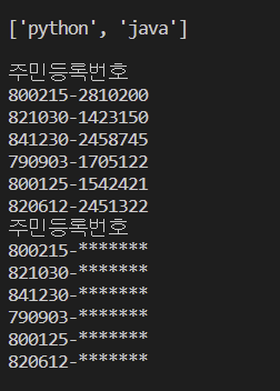 - 주민번호 칼럼을 읽어서 화면 출력, 단 주민 번호 뒷자리는 * 변경