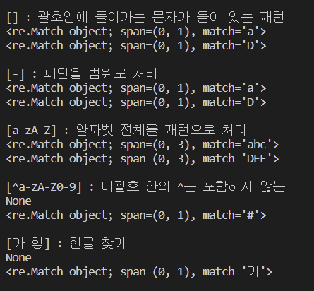 - 패턴 [ ] : [ ] 안에 있는 일치하는 문자가 있으면 매치한다
