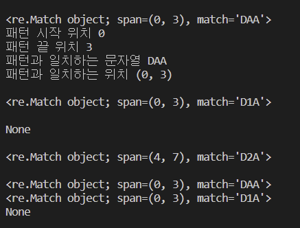 print(re.search(r"D.A", "DAA")) # 패턴이 없기 때문에 re를 사용