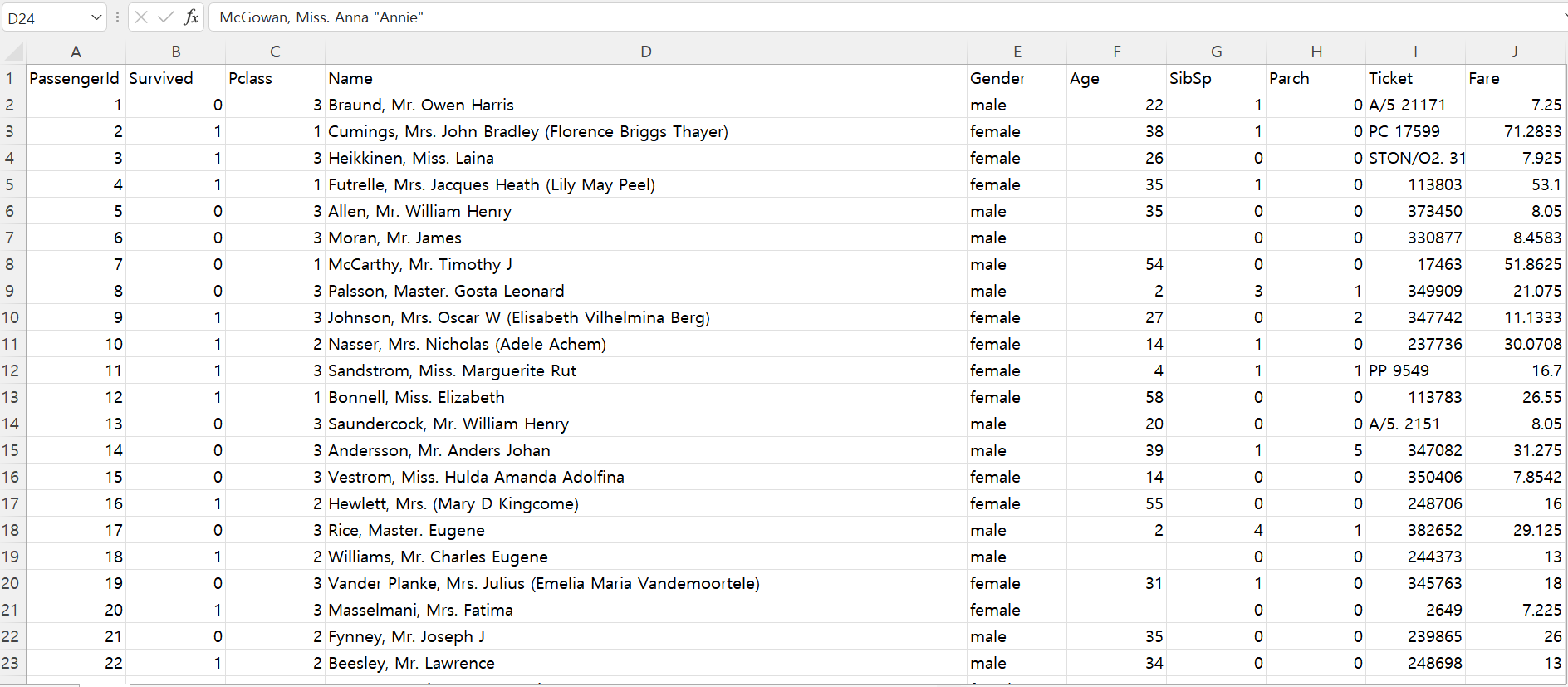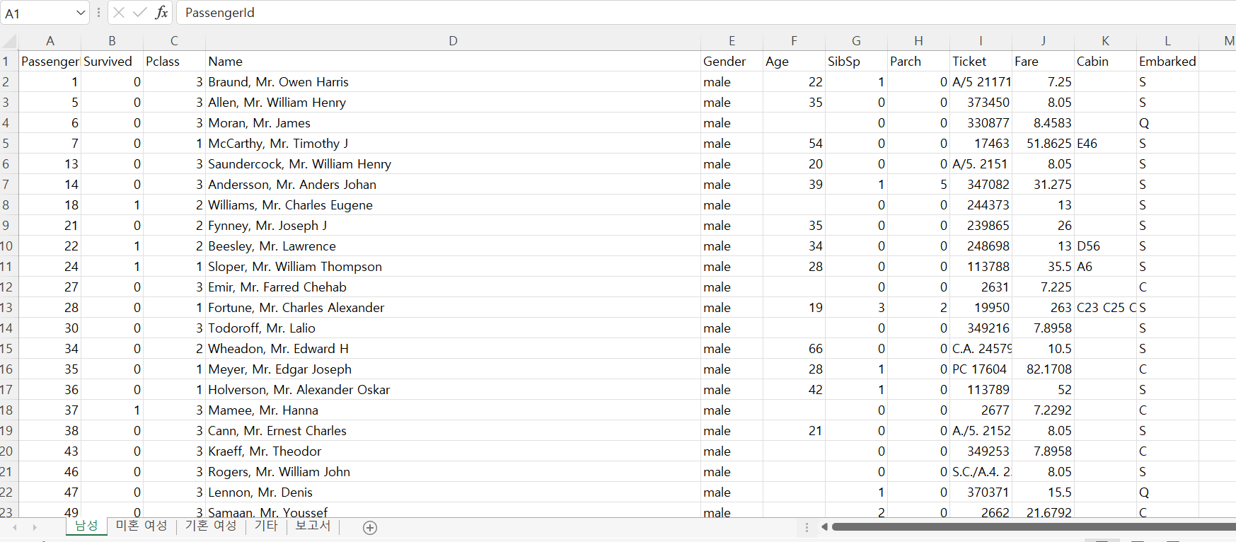 train.xlsx 읽기 - 타이타닉 탑습자 명단