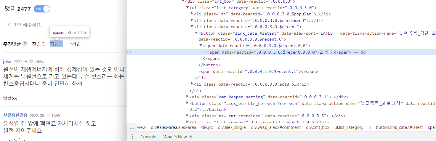 # 댓글 영역을 가져온 후 화면 출력